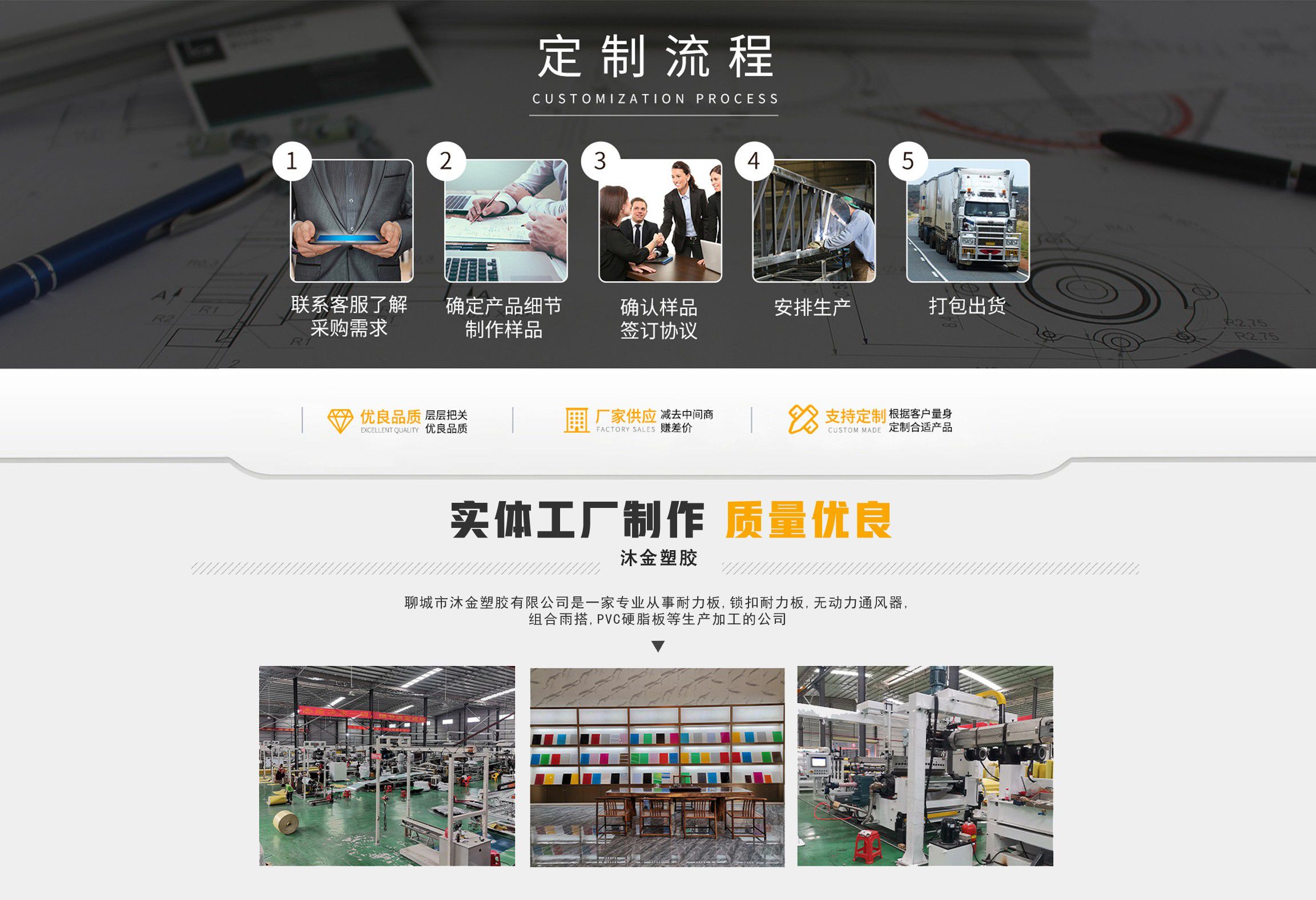 聊城市沐金塑膠有限公司注冊資金2180萬元,占地20000余平方,擁有自建廠房15000平方,員工100余名。10余年來,公司主營耐力板,鎖扣耐力板,耐力板深加工,無動力通風器,組合雨搭,PVC硬脂板,耐力板廠家等板材的發展戰略,逐漸成長為綜合性企業?! 」緭碛卸鄺l板材共擠生產線,采用世界知名品牌進口原材料和先進工藝,依據完善的ISO9001質量管理體系和ISO14001環境管理體系,為產品的卓越品質提供了強有力的保證。憑借過硬的創新能力和堅實的硬件基礎,贏創已成為國內領先的熱塑性板材生產商,產品被廣泛應用于建筑業、農業、工業、廣告業、安防行業及DIY領域?! 」臼冀K致力于通過提供最優的板材應用解決方案,為客戶創造最高的價值;堅守創新、質量、靈活、服務和速度的核心價值觀;堅持“完美的產品需要完美服務的支持”的經營理念,努力實現成為世界領先的板材與解決方案供應商的夢想。 在未來,公司將立足客戶需求,不斷改變和完善現有產品,拓展產品線和充分開發板材的應用領域,為客戶創造全方位的價值。同時更好地實現員工的價值,實現公司團隊的價值。我們將與您一起創贏未來! 企業使命:成為世界領先的板材與解決方案供應商?! 」驹妇埃和ㄟ^提供最優的板材應用解決方案,為客戶創造最高的價值?! 『诵膬r值觀:質量...
